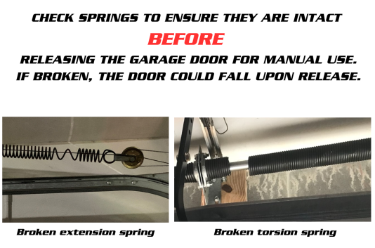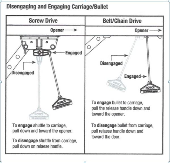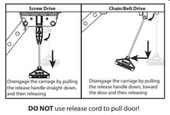 To disconnect your Genie Chain/Belt Drive Garage Door Opener, pull the release handle down, toward the door and then release.